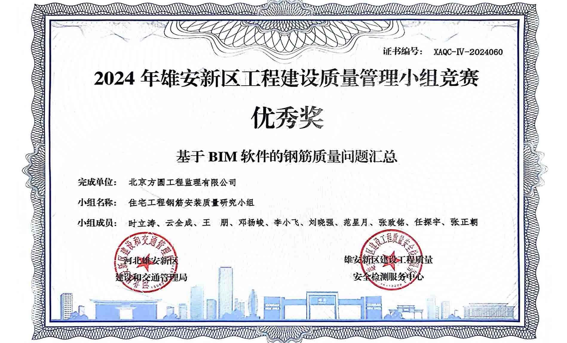 2024年12月,公司雄安新區(qū)中綠里項目參加了2024年雄安新區(qū)建設(shè)工程質(zhì)量管理小組競賽活動,由該項目監(jiān)理部和公司BIM研究所主要人員組成的研究小組提交的《基于BIM軟件的鋼筋質(zhì)量問題匯總與優(yōu)化研究》成果,憑借其創(chuàng)新