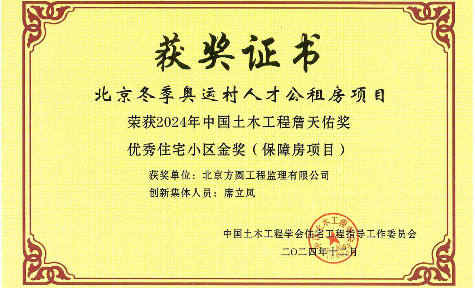 近日,由中國土木工程學(xué)會評選的2024年度詹天佑獎揭曉,我公司監(jiān)理的北京冬奧村人才公租房項目榮獲中國土木工程學(xué)會評選的2024年度詹天佑獎,該項目憑借其卓越的設(shè)計理念、高標(biāo)準(zhǔn)的施工質(zhì)量以及綠色環(huán)保的創(chuàng)新實踐,